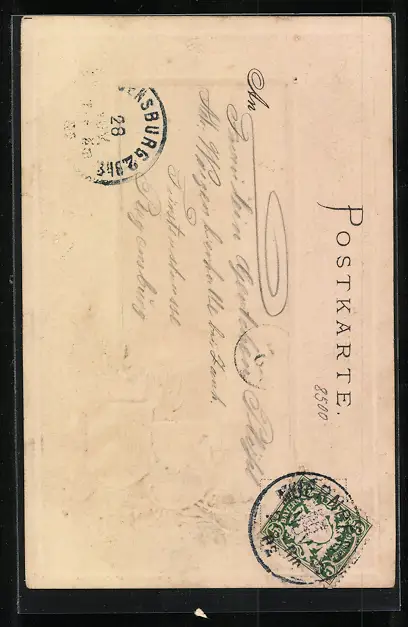 Personenbezogene Daten auf der Rückseite der Karte wurden durch blauen Textmarker unkenntlich gemacht. Die blauen Stellen sind auf die Vorderseite durchgeweicht und wirken sich negativ auf das Postkartenfoto aus