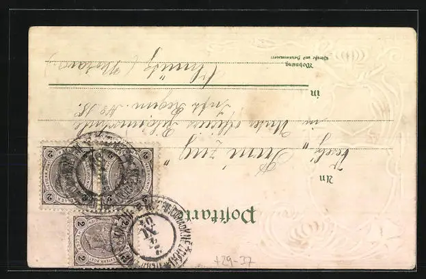 Personenbezogene Daten auf der Rückseite der Karte wurden durch blauen Textmarker unkenntlich gemacht. Die blauen Stellen sind auf die Vorderseite durchgeweicht und wirken sich negativ auf das Postkartenfoto aus