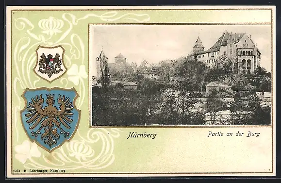 Passepartout-Lithographie Nürnberg, Ortsansicht mit Burg, Stadtwappen