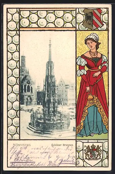 Passepartout-Lithographie Nürnberg, Schöner Brunnen, Frau in Tracht und Wappen