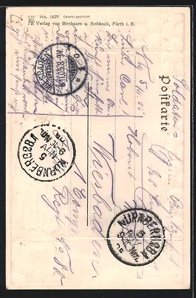 Personenbezogene Daten auf der Rückseite der Karte wurden durch blauen Textmarker unkenntlich gemacht. Die blauen Stellen sind auf die Vorderseite durchgeweicht und wirken sich negativ auf das Postkartenfoto aus