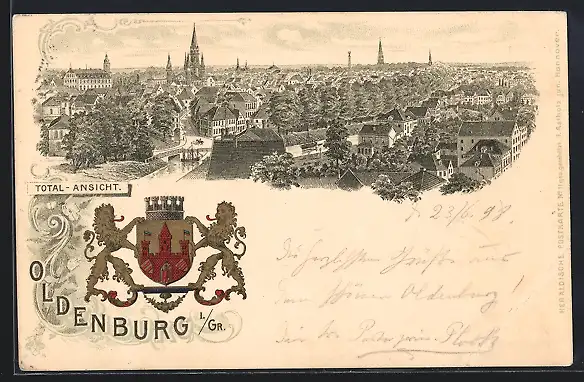 Passepartout-Lithographie Oldenburg / O., Totalansicht aus der Vogelschau, Wappen