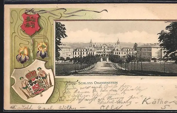 Passepartout-Lithographie Oranienstein, Partie am Schloss, Wappen
