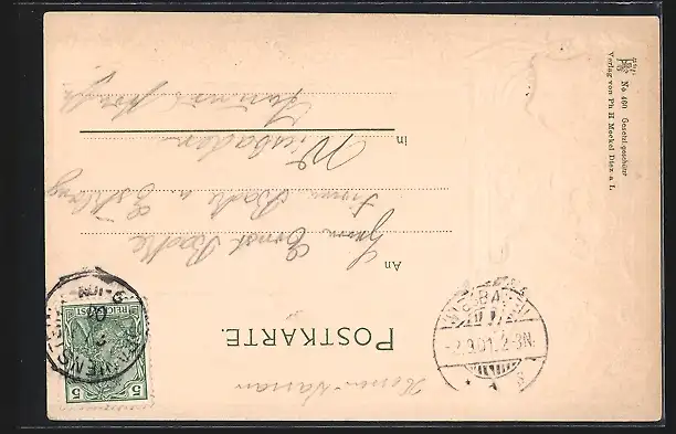 Personenbezogene Daten auf der Rückseite der Karte wurden durch blauen Textmarker unkenntlich gemacht. Die blauen Stellen sind auf die Vorderseite durchgeweicht und wirken sich negativ auf das Postkartenfoto aus