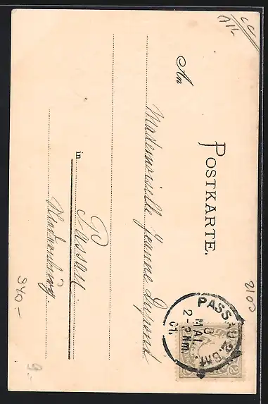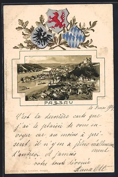 Passepartout-Lithographie Passau, Stadtpanorama, Wappen und Eichenzweig