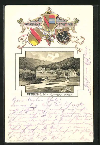 Passepartout-Lithographie Pforzheim, Kupferhammer, Wappen