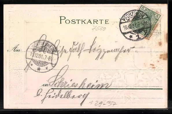 Personenbezogene Daten auf der Rückseite der Karte wurden durch blauen Textmarker unkenntlich gemacht. Die blauen Stellen sind auf die Vorderseite durchgeweicht und wirken sich negativ auf das Postkartenfoto aus