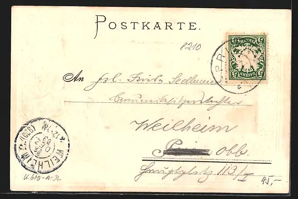 Personenbezogene Daten auf der Rückseite der Karte wurden durch blauen Textmarker unkenntlich gemacht. Die blauen Stellen sind auf die Vorderseite durchgeweicht und wirken sich negativ auf das Postkartenfoto aus