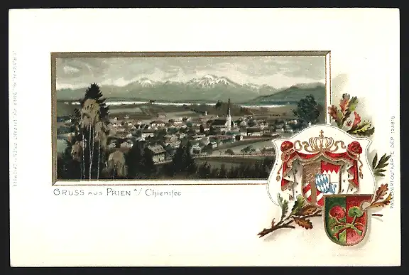 Passepartout-Lithographie Prien, Gesamtansicht, Wappen