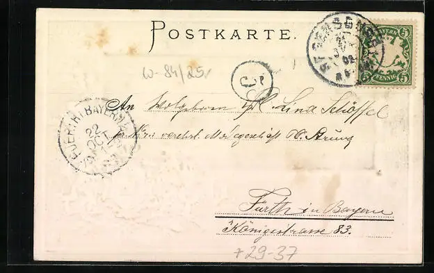 Personenbezogene Daten auf der Rückseite der Karte wurden durch blauen Textmarker unkenntlich gemacht. Die blauen Stellen sind auf die Vorderseite durchgeweicht und wirken sich negativ auf das Postkartenfoto aus