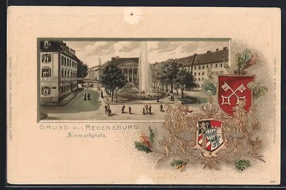 Passepartout-Lithographie Regensburg, Wappen und Bismarckplatz