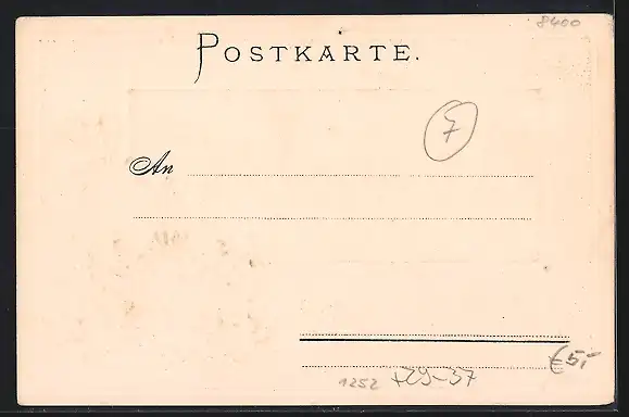 Personenbezogene Daten auf der Rückseite der Karte wurden durch blauen Textmarker unkenntlich gemacht. Die blauen Stellen sind auf die Vorderseite durchgeweicht und wirken sich negativ auf das Postkartenfoto aus