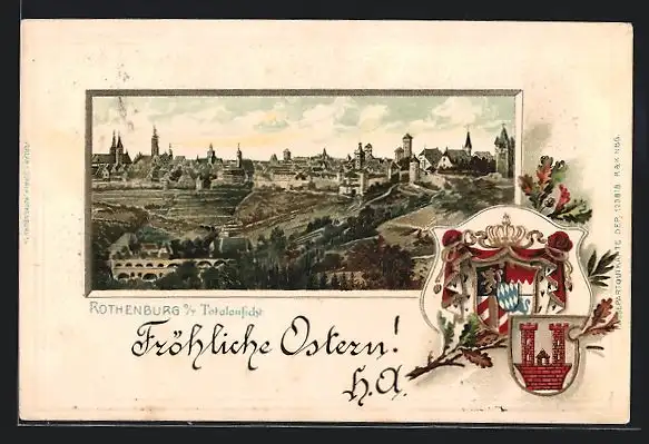 Passepartout-Lithographie Rothenburg, Totalansicht, Wappen