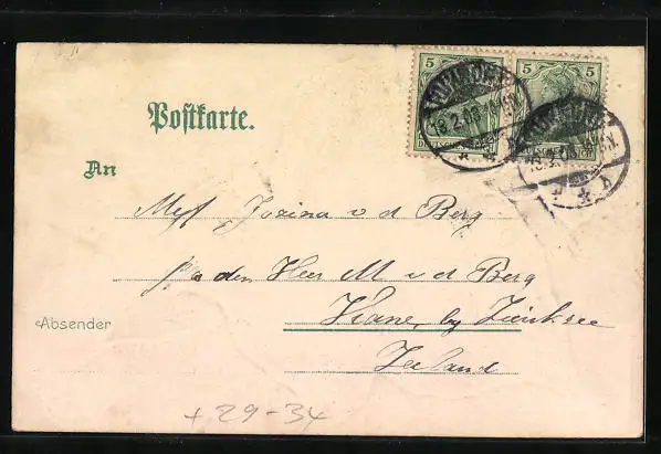 Personenbezogene Daten auf der Rückseite der Karte wurden durch blauen Textmarker unkenntlich gemacht. Die blauen Stellen sind auf die Vorderseite durchgeweicht und wirken sich negativ auf das Postkartenfoto aus