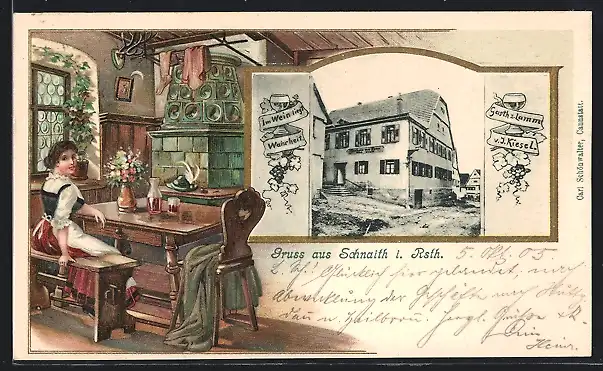 Passepartout-Lithographie Schnaith / Württ, Gasthaus zum Lamm, Bes. J. Kiesel