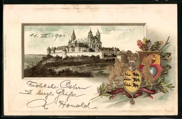 Passepartout-Lithographie Schwäbisch Hall, Die Comburg, Wappen, Eichenlaub
