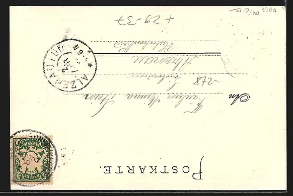 Personenbezogene Daten auf der Rückseite der Karte wurden durch blauen Textmarker unkenntlich gemacht. Die blauen Stellen sind auf die Vorderseite durchgeweicht und wirken sich negativ auf das Postkartenfoto aus