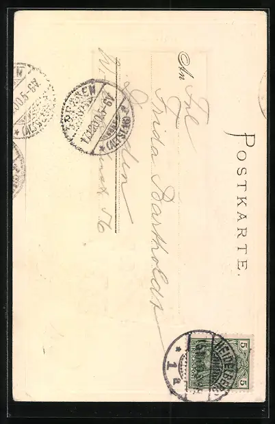 Personenbezogene Daten auf der Rückseite der Karte wurden durch blauen Textmarker unkenntlich gemacht. Die blauen Stellen sind auf die Vorderseite durchgeweicht und wirken sich negativ auf das Postkartenfoto aus