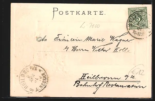 Personenbezogene Daten auf der Rückseite der Karte wurden durch blauen Textmarker unkenntlich gemacht. Die blauen Stellen sind auf die Vorderseite durchgeweicht und wirken sich negativ auf das Postkartenfoto aus