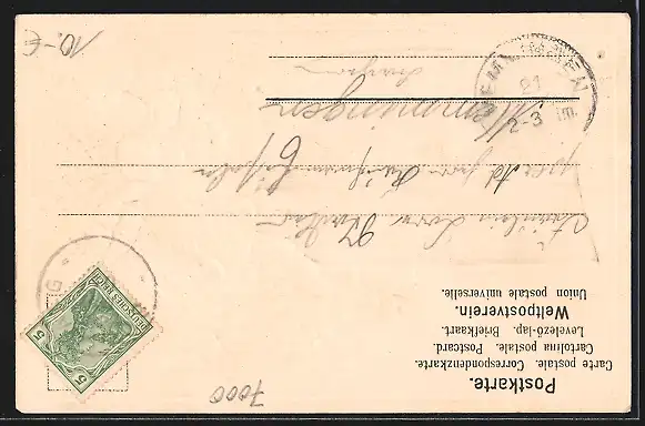Personenbezogene Daten auf der Rückseite der Karte wurden durch blauen Textmarker unkenntlich gemacht. Die blauen Stellen sind auf die Vorderseite durchgeweicht und wirken sich negativ auf das Postkartenfoto aus