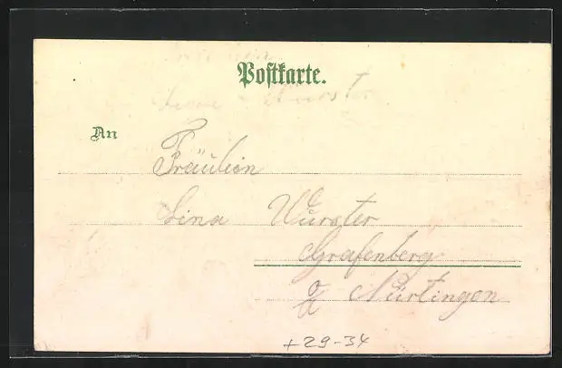 Personenbezogene Daten auf der Rückseite der Karte wurden durch blauen Textmarker unkenntlich gemacht. Die blauen Stellen sind auf die Vorderseite durchgeweicht und wirken sich negativ auf das Postkartenfoto aus