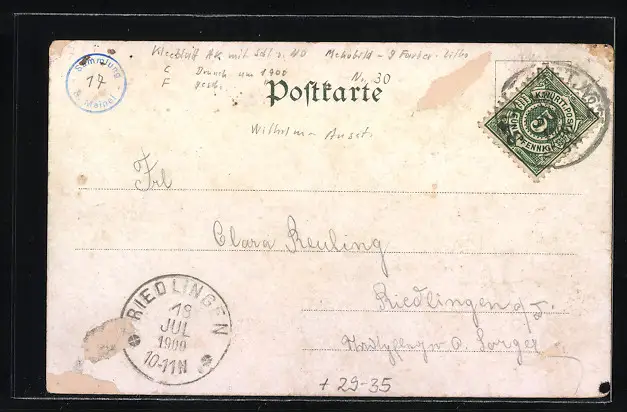 gelaufen 1900, rückseitig Oberflächenschaden, Eckknick oben links, guter Zustand