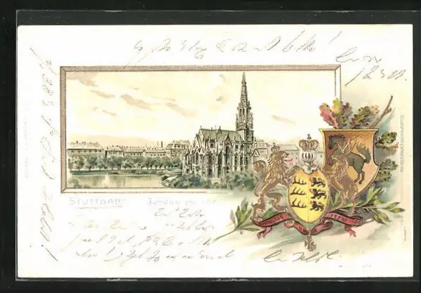 Passepartout-Lithographie Stuttgart, Johanniskirche im Stadtbild, Wappen