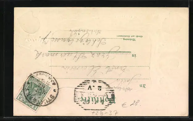 Personenbezogene Daten auf der Rückseite der Karte wurden durch blauen Textmarker unkenntlich gemacht. Die blauen Stellen sind auf die Vorderseite durchgeweicht und wirken sich negativ auf das Postkartenfoto aus
