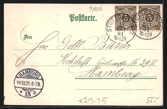 Personenbezogene Daten auf der Rückseite der Karte wurden durch blauen Textmarker unkenntlich gemacht. Die blauen Stellen sind auf die Vorderseite durchgeweicht und wirken sich negativ auf das Postkartenfoto aus