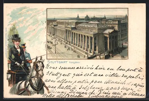 Passepartout-Lithographie Stuttgart, Königsbau, hübsche Kutscherin
