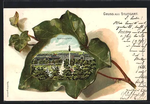 Passepartout-Lithographie Stuttgart, Laubblatt und Schlossplatz