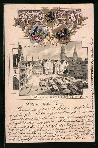 Passepartout-Lithographie Stuttgart, Marktplatz aus der Vogelschau, Wappen