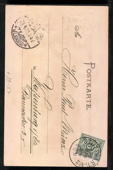 Personenbezogene Daten auf der Rückseite der Karte wurden durch blauen Textmarker unkenntlich gemacht. Die blauen Stellen sind auf die Vorderseite durchgeweicht und wirken sich negativ auf das Postkartenfoto aus