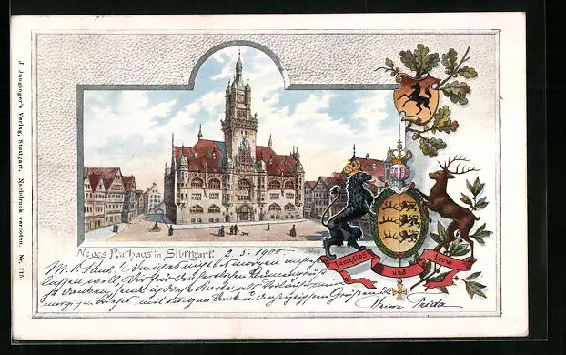 Passepartout-Lithographie Stuttgart, Neues Rathaus, Wappen