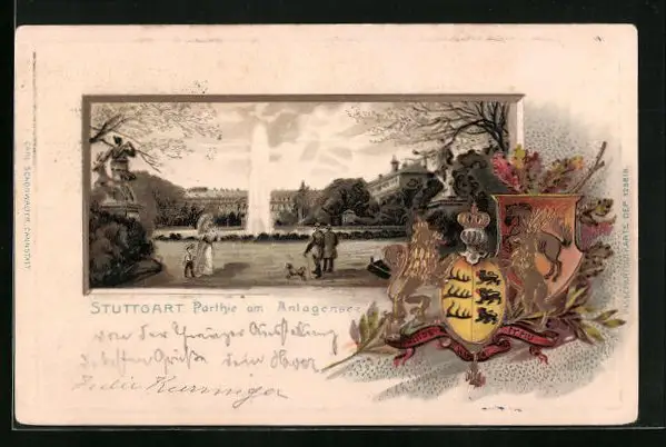 Passepartout-Lithographie Stuttgart, Partie am Anlagensee, Wappen