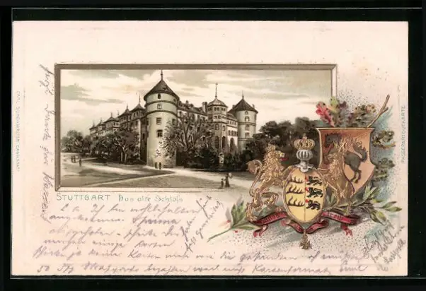 Passepartout-Lithographie Stuttgart, Partie am alten Schloss, Wappen
