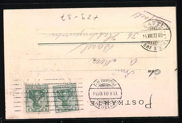Personenbezogene Daten auf der Rückseite der Karte wurden durch blauen Textmarker unkenntlich gemacht. Die blauen Stellen sind auf die Vorderseite durchgeweicht und wirken sich negativ auf das Postkartenfoto aus