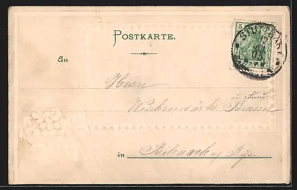 Personenbezogene Daten auf der Rückseite der Karte wurden durch blauen Textmarker unkenntlich gemacht. Die blauen Stellen sind auf die Vorderseite durchgeweicht und wirken sich negativ auf das Postkartenfoto aus