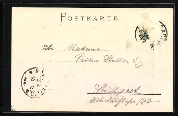 Personenbezogene Daten auf der Rückseite der Karte wurden durch blauen Textmarker unkenntlich gemacht. Die blauen Stellen sind auf die Vorderseite durchgeweicht und wirken sich negativ auf das Postkartenfoto aus