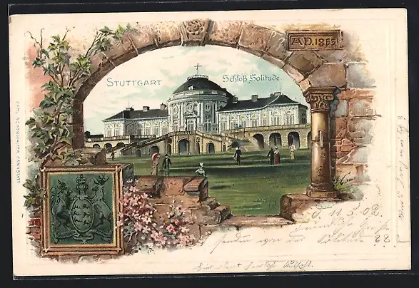 Passepartout-Lithographie Stuttgart, Schloss Solitude, Wappen