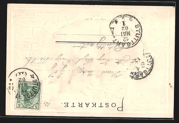 Personenbezogene Daten auf der Rückseite der Karte wurden durch blauen Textmarker unkenntlich gemacht. Die blauen Stellen sind auf die Vorderseite durchgeweicht und wirken sich negativ auf das Postkartenfoto aus