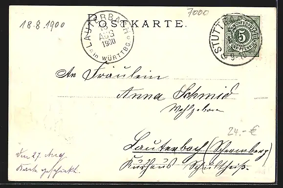 Personenbezogene Daten auf der Rückseite der Karte wurden durch blauen Textmarker unkenntlich gemacht. Die blauen Stellen sind auf die Vorderseite durchgeweicht und wirken sich negativ auf das Postkartenfoto aus
