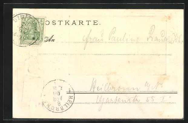 Personenbezogene Daten auf der Rückseite der Karte wurden durch blauen Textmarker unkenntlich gemacht. Die blauen Stellen sind auf die Vorderseite durchgeweicht und wirken sich negativ auf das Postkartenfoto aus