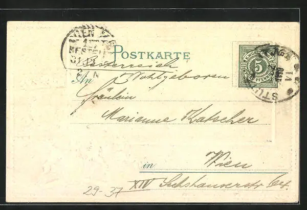 Personenbezogene Daten auf der Rückseite der Karte wurden durch blauen Textmarker unkenntlich gemacht. Die blauen Stellen sind auf die Vorderseite durchgeweicht und wirken sich negativ auf das Postkartenfoto aus