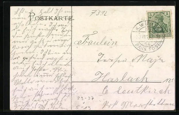 Personenbezogene Daten auf der Rückseite der Karte wurden durch blauen Textmarker unkenntlich gemacht. Die blauen Stellen sind auf die Vorderseite durchgeweicht und wirken sich negativ auf das Postkartenfoto aus