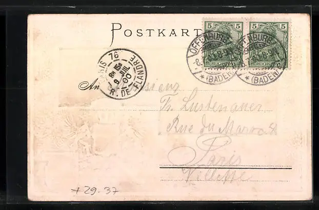 Personenbezogene Daten auf der Rückseite der Karte wurden durch blauen Textmarker unkenntlich gemacht. Die blauen Stellen sind auf die Vorderseite durchgeweicht und wirken sich negativ auf das Postkartenfoto aus