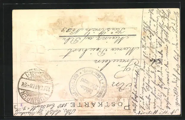 Personenbezogene Daten auf der Rückseite der Karte wurden durch blauen Textmarker unkenntlich gemacht. Die blauen Stellen sind auf die Vorderseite durchgeweicht und wirken sich negativ auf das Postkartenfoto aus