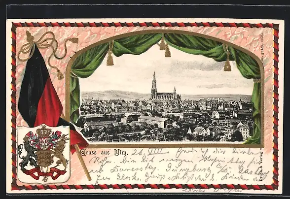 Passepartout-Lithographie Ulm, Totalansicht mit Wappen