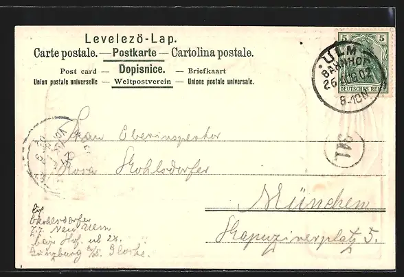 Personenbezogene Daten auf der Rückseite der Karte wurden durch blauen Textmarker unkenntlich gemacht. Die blauen Stellen sind auf die Vorderseite durchgeweicht und wirken sich negativ auf das Postkartenfoto aus