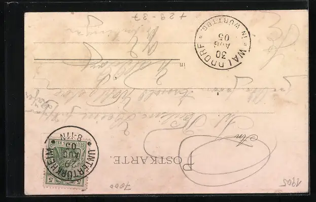 Personenbezogene Daten auf der Rückseite der Karte wurden durch blauen Textmarker unkenntlich gemacht. Die blauen Stellen sind auf die Vorderseite durchgeweicht und wirken sich negativ auf das Postkartenfoto aus